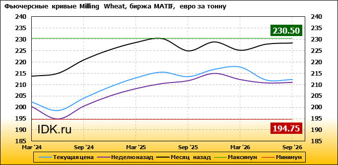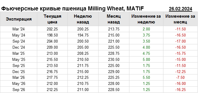 На 26.02.2024 стоимость пшеницы Milling Wheat на бирже MATIF по контракту Mar ’24 составила 202.25 евро за тонну. За прошедшую неделю стоимость пшеницы Milling Wheat выросла на 2 евро/тонна. Как мы видим на графике, фьючерсная кривая имеет периоды, когда более дальний фьючерс дешевле ближнего. Состояние бэквардации наблюдаем на следующих контрактах: May ’24; Sep ’25; May ’26. Таким образом, трейдеры предполагают, что возможно превалирование предложения над спросом в указанные периоды.