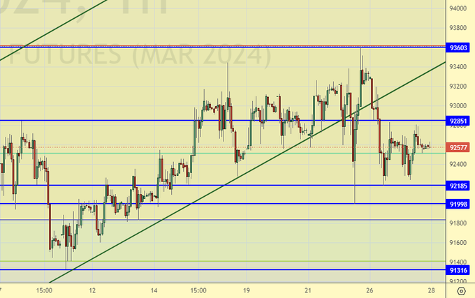 Остается возможность для входа в шорт. Если несколько часов проведем под 92.00, то это может привести к развитию падающего движения. Вряд ли мы увидим сильное укрепление рубля, но «поклон» в сторону выборов скорее всего будет сделан.