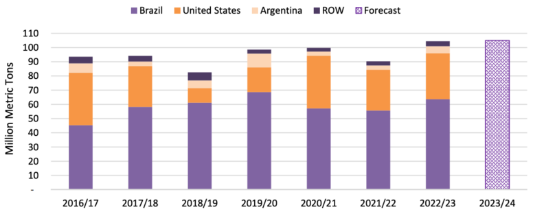 В перспективе прогнозируется дальнейшее снижение экспорта сои из США в 2023/24 маркетинговом году. Этот прогноз основан на ожидании того, что внутреннее производство продолжит расти, а также продолжится крупное производство сои в Южной Америке. Между тем, ожидается, что экспорт соевого шрота из США продолжит расти в 2023/24 году. Однако обильные мировые поставки из-за более высокой переработки сои в Южной Америке будут препятствовать значительному росту экспорта. Ожидается, что соевый шрот станет более конкурентоспособным кормовым ингредиентом при увеличении мировых поставок.