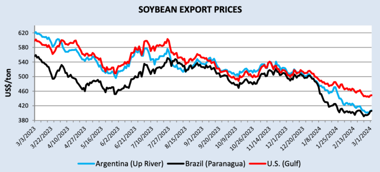 Экспорт сои в 2023 году упал в стоимостном выражении на три из четырех крупнейших рынков по сравнению с прошлым годом: Китай (-15 процентов), Мексика (-24 процента) и Япония (26 процентов). Основными причинами этого снижения являются рекордное производство сои в Бразилии и более высокий спрос на сою в США, что способствовало росту цен на сою в США. Между тем, экспорт в Европейский Союз вырос на 32 процента в стоимостном выражении, отчасти из-за увеличения спроса Китая на бразильскую сою.
