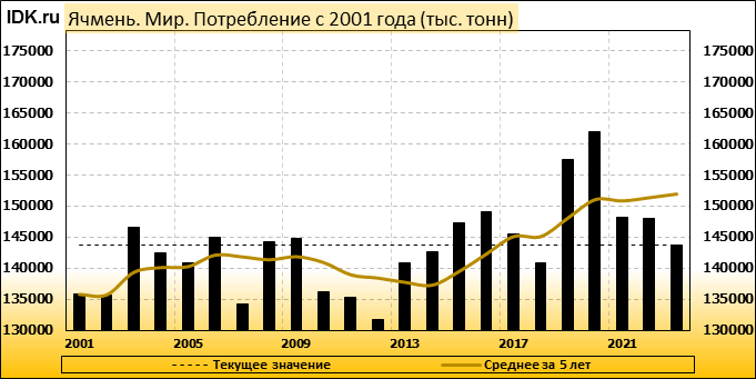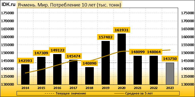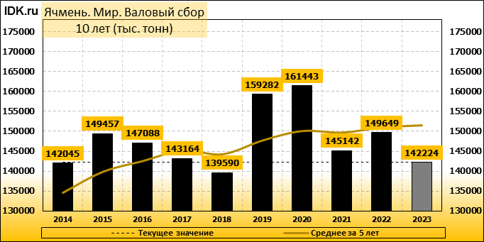 Мировой объем производства ячменя в 2022/2023 сельскохозяйственном году составил около 151,62 миллиона тонн, увеличившись с примерно 145,37 миллиона тонн в 2021/2022 году.