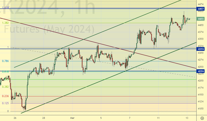 Продолжаем считать, что мы находимся в интересном районе для очередного раунда продаж. Вряд ли рынок сможет пройти выше 450.0 сейчас. Кукурузы много, а у доллара есть шансы на укрепление.
