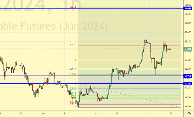 Видим рост волатильности. При этом просматривается желание прокатиться вверх к 97.00. Не исключено, что это и произойдет до и сразу после заседания ЦБ РФ (в пятницу). Отметим, что для идеальной покупки нам нужно падение к 93400.
