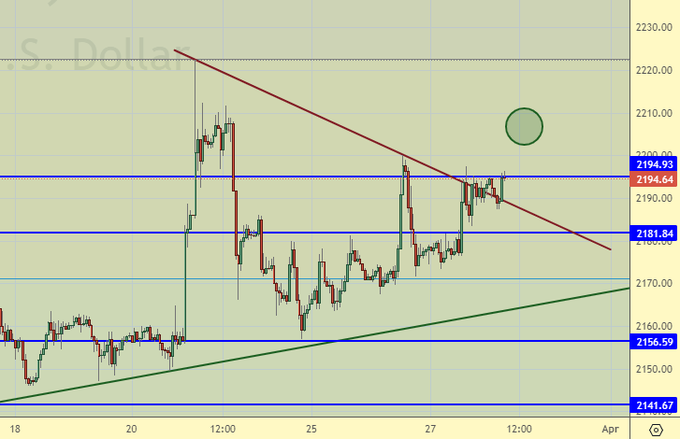 Очередная попытка пробиться выше 2200. Это, откровенно, крайне неудобное развитие событий, тем более если придется покупать по тренду, для того чтобы не пропустить ход на 2400. Если мы продолжим расти без отката к 2080, тогда можно говорить о том, что страх разбалансировки финансовой системы растет.