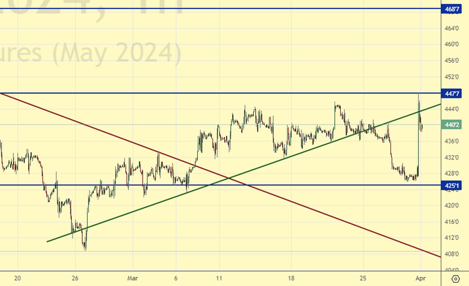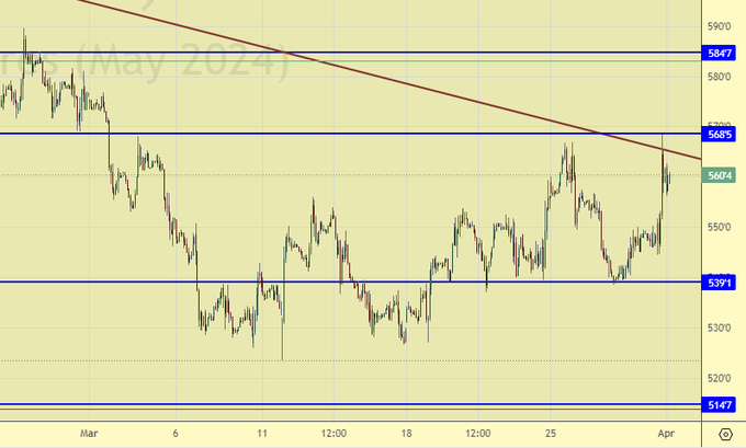 После католической Пасхи рынок будет осмысливать сокращение посевных площадей в США на 4% по пшенице, а также появление прогнозов о сокращении урожая мягкой пшеницы в ЕС в сезоне 24/25 до 120.8 млн. тонн, что на 4% меньше, чем в прошлом году. Это явно бычьи сигналы, которые могут заставить расти цены весь апрель.