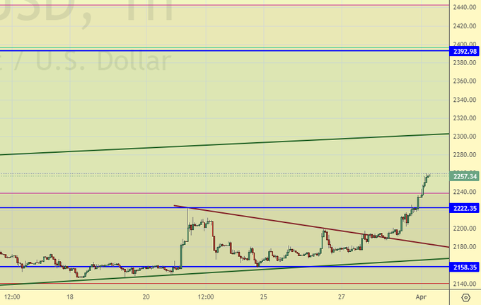 Рынок продолжает уходить быстро вверх, что заставляет нас рассуждать о ралли. Быки теперь вряд ли дадут шансы на покупку по интересным ценам. Мы идем к 2400 – цели, о которой говорили еще много месяцев назад. Продолжаем отмечать, что у золота очень хорошие перспективы.