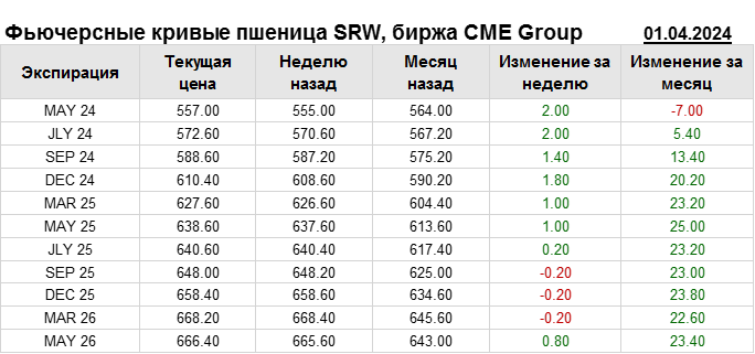 На 01.04.2024 стоимость пшеницы SRW на бирже CME Group по контракту MAY 24 составила 557 цента за бушель. За прошедшую неделю стоимость пшеницы SRW выросла на 2 цента/бушель. Как мы видим на графике, фьючерсная кривая имеет периоды, когда более дальний фьючерс дешевле ближнего. Состояние бэквардации наблюдаем на следующих контрактах: MAY 26. Таким образом, трейдеры предполагают, что возможно превалирование предложения над спросом в указанные периоды.