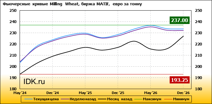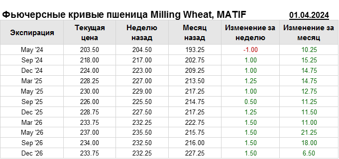На 01.04.2024 стоимость пшеницы Milling Wheat на бирже MATIF по контракту May ’24 составила 203.5 евро за тонну. За прошедшую неделю стоимость пшеницы Milling Wheat упала на 1 евро/тонна. Как мы видим на графике, фьючерсная кривая имеет периоды, когда более дальний фьючерс дешевле ближнего. Состояние бэквардации наблюдаем на следующих контрактах: Sep ’25; Sep ’26; Dec ’26. Таким образом, трейдеры предполагают, что возможно превалирование предложения над спросом в указанные периоды.
