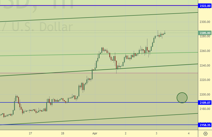 Покупка: при откате к 2180. Стоп: 2140. Цель: 2400.