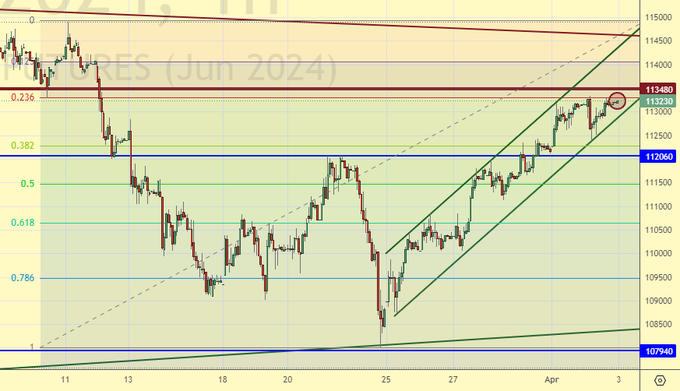 Продажа: в случае появления длинной красной свечки вниз. Стоп: 113550. Цель: 110000.
