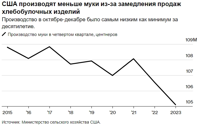 США производят меньше муки на фоне снижения продаж хлебобулочных изделий. Объем производства в октябре-декабре был самым низким за последнее десятилетие. Источник: Министерство сельского хозяйства США