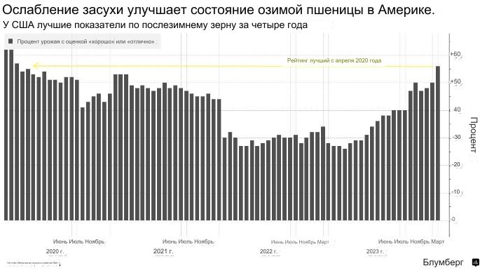 Прошлой весной поля были настолько поражены засухой, что фермеры отказывались от посевов самыми высокими темпами более за чем столетие. Некоторые американские мукомольные предприятия в поисках поставок в это время были вынуждены прибегнуть к редкому импорту, в том числе из Польши и Франции, чтобы восполнить дефицит на внутреннем рынке. Однако в этом году 56% урожая озимой пшеницы оценивается Министерством сельского хозяйства США как хороший или отличный, что вдвое больше, чем год назад.