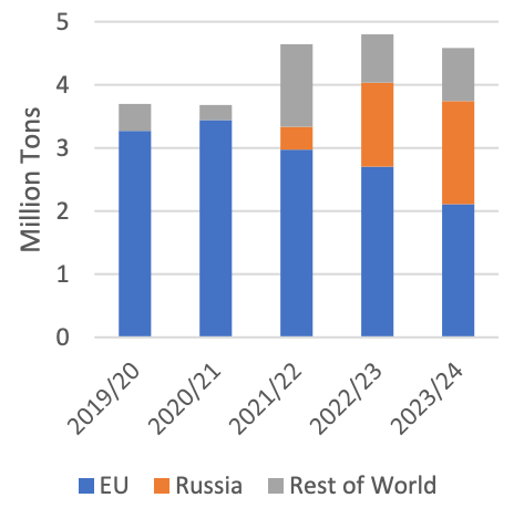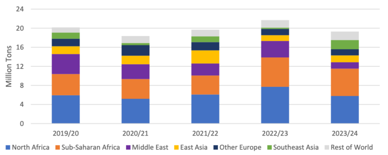 Экспорт пшеницы из Европейского Союза (ЕС) в 2023/24 году (июль-июнь) прогнозируется на 2,0 миллиона тонн в этом месяце до 34,5 миллиона, поскольку регион теряет долю рынка в пользу России в Африке и на Ближнем Востоке. Ведущими рынками для пшеницы ЕС обычно являются Северная Африка, страны Африки к югу от Сахары и Ближний Восток. За первые 7 месяцев маркетингового года поставки в Северную Африку сократились на 25 процентов по сравнению с аналогичным периодом прошлого года, а поставки на Ближний Восток сократились более чем на 60 процентов. В этих регионах ЕС сталкивается с беспрецедентной конкуренцией со стороны российской пшеницы.