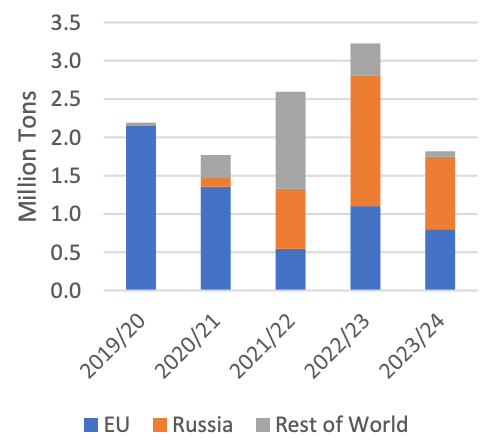 Саудовская Аравия исторически была ведущим рынком для пшеницы из ЕС: Европейский Союз занимал почти 95 процентов доли рынка за 5 лет, предшествовавших 2019/20 году. В то время как спрос на импорт пшеницы в Саудовской Аравии снизился в 2023/24 году, поскольку внутреннее производство увеличилось из-за высоких внутренних закупочных цен, импортные предпочтения государственного покупателя Глобального управления продовольственной безопасности (GFSA) сместились с пшеницы из ЕС в сторону российской пшеницы. GFSA является единственным импортером пшеницы, осуществляющим закупки. через международные тендеры. Поставки российской пшеницы на этих тендерах становятся все более конкурентоспособными по цене, вытесняя Европейский Союз с позиции главного поставщика.