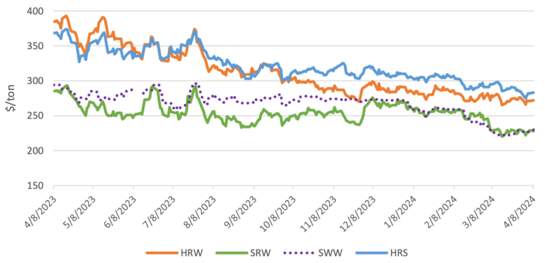Внутренний рынок: котировки в США мало изменились со времени мартовского отчета WASDE: Soft Red Winter (SRW) снизилась всего на 2 доллара до 228 долларов за тонну, а котировки Hard Red Winter (HRW) остались неизменными по цене 272 доллара за тонну и Soft White (SWW) по цене 230 долларов за тонну. Урожай озимой пшеницы оценивается в 56 процентах от хорошего до отличного состояния по сравнению с 27 процентами за тот же период прошлого года. Напротив, цены на Hard Red Spring (HRS) упали на 12 долларов до 283 долларов за тонну, что отражает увеличение посевных площадей весной в отчете NASS о перспективных посадках.