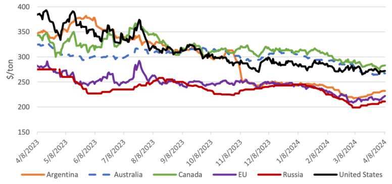 Мировой рынок: Котировки основных экспортеров сравнялись после мартовского отчета WASDE, при этом спред между крупнейшими и самыми низкими экспортерами сократился на 21 доллар за тонну. Российские котировки выросли на 12 долларов за тонну, поскольку сохранялся высокий спрос на доступную пшеницу. Котировки ЕС выросли на 13 долларов за тонну, сохранив ценовую премию по сравнению с сырьем черноморского происхождения. Аргентинские котировки выросли на 15 долларов за тонну на фоне роста мирового спроса и высокого экспортного спроса. Котировки Канады упали на 9 долларов за тонну из-за конкуренции со стороны других крупных экспортеров. Австралийские котировки упали на $15 за тонну, поскольку покупатели отложили крупные поставки. Котировки в США были исключением: они остались на прежнем уровне при умеренных продажах и поставках.