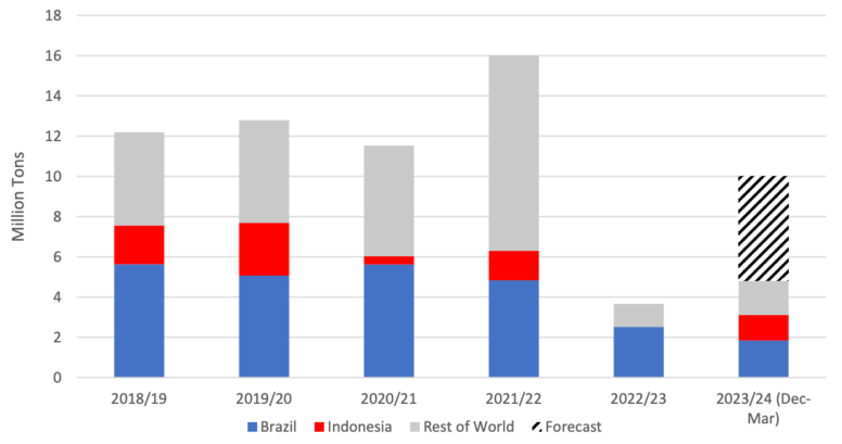 Бразилия выигрывает как от близости к Аргентине, так и от благоприятного торгового режима в рамках МЕРКОСУР. В последние годы Бразилия увеличила производство пшеницы, но по-прежнему зависит от импорта для удовлетворения внутренних потребностей. На урожай 2023/24 года в Бразилии негативно повлияли дожди в конце сезона во время сбора урожая, в результате чего урожай был меньше, чем ожидалось, и увеличилась доля пшеницы фуражного качества. Следовательно, Бразилия увеличит импорт пшеницы в 2023/24 году, большая часть которой уже поступила и будет поступать из Аргентины.
