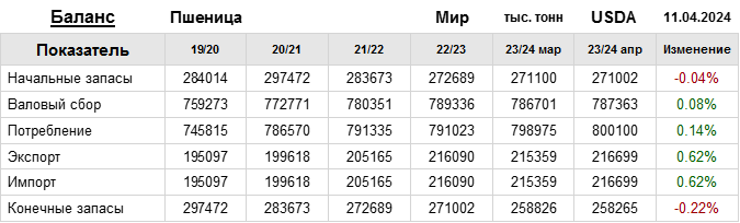 За прошедший месяц министерство сельского хозяйства США (USDA) на 11.04.2024 пересмотрело Баланс пшеницы для Мира в сезоне 23/24 следующим образом: