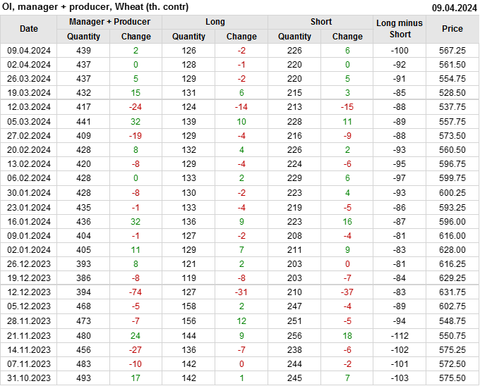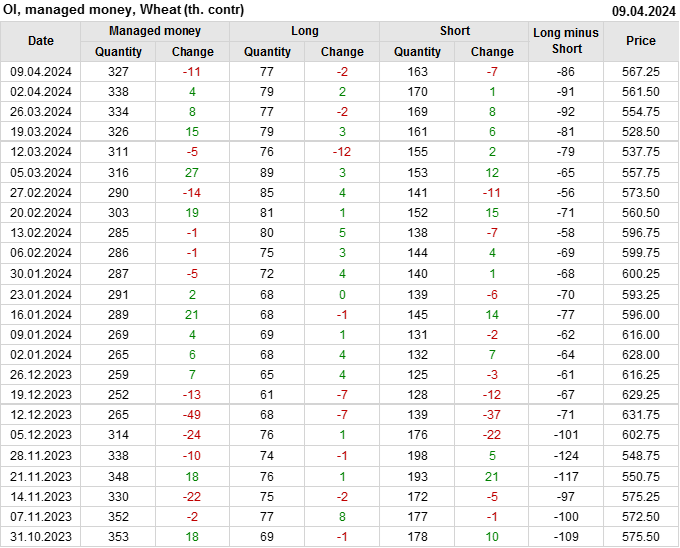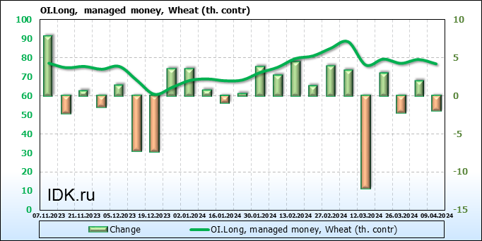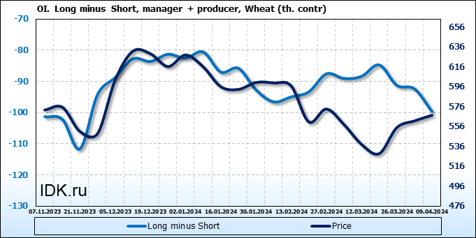 За прошедшую неделю, 03.04.24 — 09.04.24, разница между длинными и короткими позициями управляющих сократилась на 5.2 тыс. контрактов. В тоже время, цена выросла на 5.75 цента.