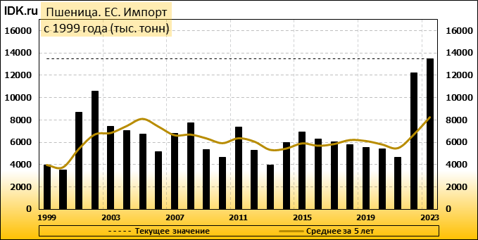 За прошедший месяц министерство сельского хозяйства США (USDA) на 11.04.2024 пересмотрело Баланс пшеницы для ЕС в сезоне 23/24 следующим образом: