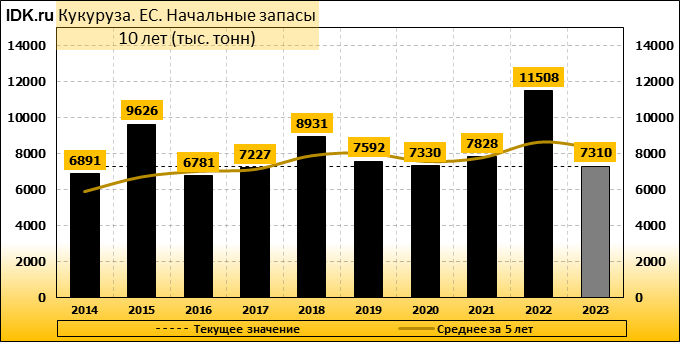 За прошедший месяц министерство сельского хозяйства США (USDA) на 11.04.2024 пересмотрело Баланс кукурузы для ЕС в сезоне 23/24 следующим образом: