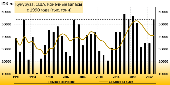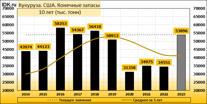 Конечные запасы: составят 53896 тысяч тонн. Оценка с последнего отчета снизилась на -2.3 процента.