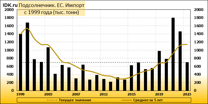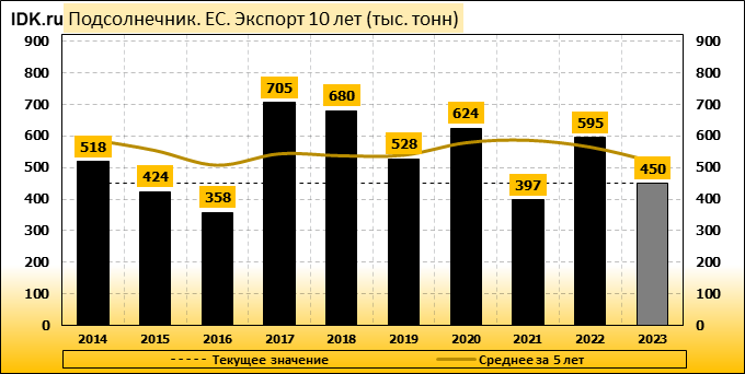 С 1 июля по 26 ноября 2023 года Румыния экспортировала за пределы Европейского Союза 64053 тонны семян подсолнечника, что составляет половину от общего объема, экспортированного ЕС (131853 тонны). Импорт семян подсолнечника с третьих рынков также поставил Румынию на первое место с 78836 тоннами. Всего Европейский Союз импортировал 190 619 тонн семян подсолнечника, что на 85% меньше, чем за тот же период прошлого года. Основными источниками стали Молдова (119983 тонны по сравнению со 108093 тоннами за аналогичный период 2022 года), Украина (резкое снижение с 1085480 тонн до 35760 тонн – при текущей доле рынка 18,8% по сравнению с 86,7% в прошлом году), Китай, Турция и Аргентина.