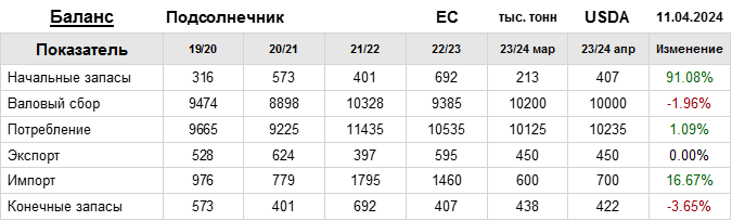 За прошедший месяц министерство сельского хозяйства США (USDA) на 11.04.2024 пересмотрело Баланс подсолнечника для ЕС в сезоне 23/24 следующим образом: