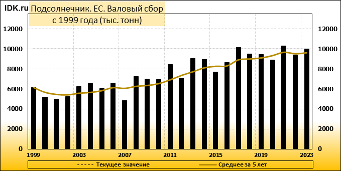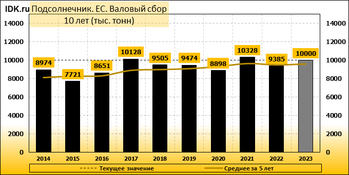 Валовый сбор: оценка пересмотрена в сторону понижения до 10000 тысяч тонн. Показатель упал на -1.96 процента.