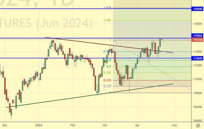 Сценарий роста: рассматриваем июньский фьючерс, дата экспирации 20 июня. Пока мы 116000 не взяли. А раз так, то и покупать не будем. Желающие могут отработать ход до 120000 на часовых интервалах.
