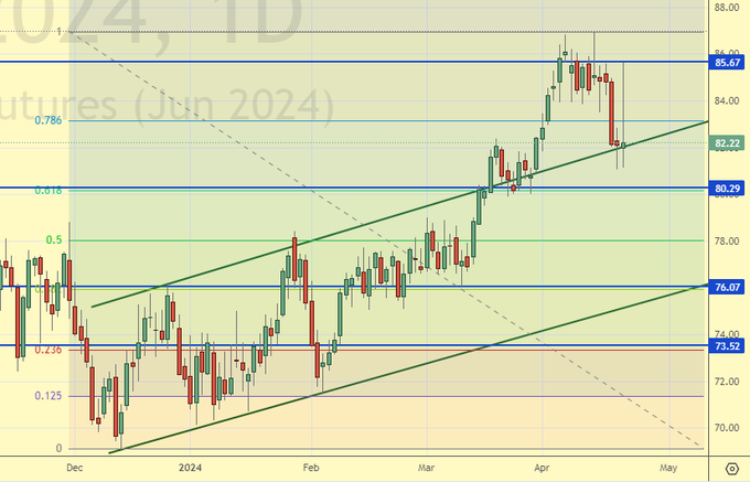 Сценарий роста: рассматриваем апрельский фьючерс, дата экспирации 30 апреля. Покупки не делаем. Ждем откат к 82.40 и 81.00.