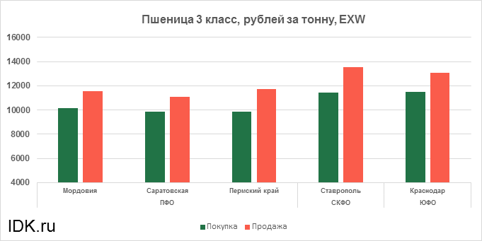 За прошедшую неделю с 15.04.2024 по 19.04.2024 средняя цена на пшеницу 3-го класса, согласно выставленным заявкам трейдеров, выросла по всем округам на 430 рублей. Средняя цена составляет 11839 рублей за тонну.
