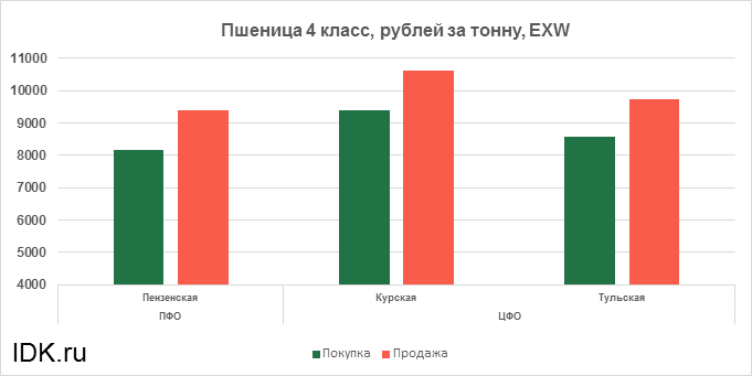 За прошедшую неделю с 15.04.2024 по 19.04.2024 средняя цена на пшеницу 4-го класса, согласно выставленным заявкам трейдеров, упала по всем округам на 754 рубля. Средняя цена составляет 9227 рублей за тонну.