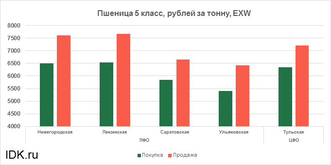 За прошедшую неделю с 15.04.2024 по 19.04.2024 средняя цена на пшеницу 5-го класса, согласно выставленным заявкам трейдеров, упала по всем округам на 343 рубля. Средняя цена составляет 6737 рублей за тонну.