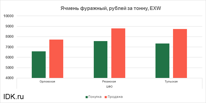 За прошедшую неделю с 15.04.2024 по 19.04.2024 средняя цена на фуражный ячмень, согласно выставленным заявкам трейдеров, упала по всем округам на 397 рублей. Средняя цена составляет 7566 рублей за тонну.