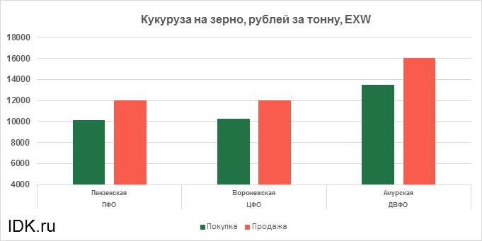 За прошедшую неделю с 15.04.2024 по 19.04.2024 средняя цена кукурузы на зерно, согласно выставленным заявкам трейдеров, выросла по всем округам на 150 рублей. Средняя цена составляет 12323 рублей за тонну.