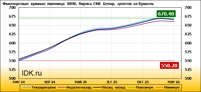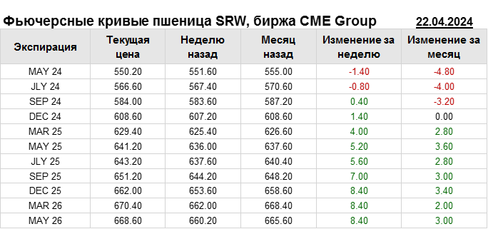 На 22.04.2024 стоимость пшеницы SRW на бирже CME Group по контракту MAY 24 составила 550.2 цента за бушель. За прошедшую неделю стоимость пшеницы SRW упала на 1.4 цента/бушель. Как мы видим на графике, фьючерсная кривая имеет периоды, когда более дальний фьючерс дешевле ближнего. Состояние бэквардации наблюдаем на следующих контрактах: MAY 26. Таким образом, трейдеры предполагают, что возможно превалирование предложения над спросом в указанные периоды.
