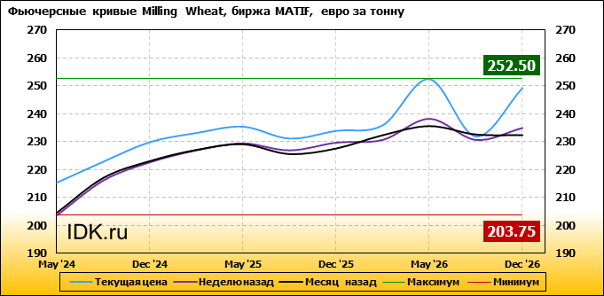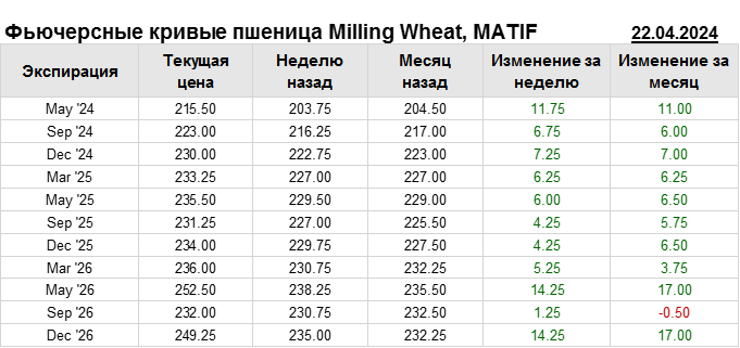 На 22.04.2024 стоимость пшеницы Milling Wheat на бирже MATIF по контракту May ’24 составила 215.5 евро за тонну. За прошедшую неделю стоимость пшеницы Milling Wheat выросла на 11.75 евро/тонна. Как мы видим на графике, фьючерсная кривая имеет периоды, когда более дальний фьючерс дешевле ближнего. Состояние бэквардации наблюдаем на следующих контрактах: Sep ’25; Sep ’26. Таким образом, трейдеры предполагают, что возможно превалирование предложения над спросом в указанные периоды.