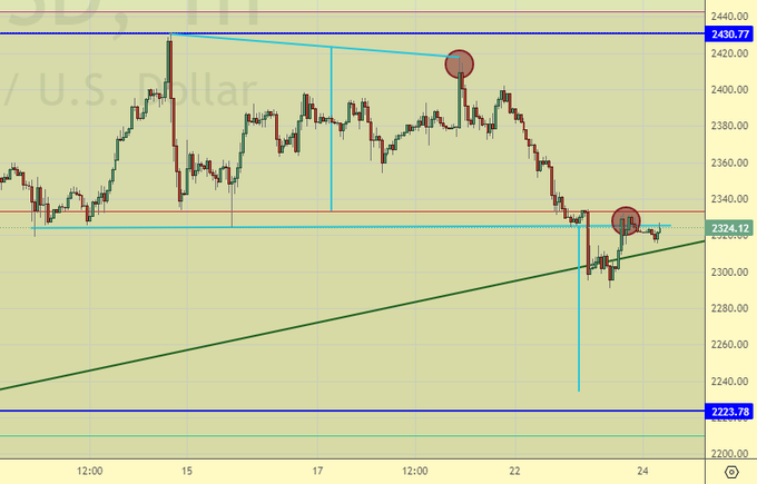 Имеет смысл добавить к шортам или открыть отдельную независимую позицию на продажу. В расчете на то, что мы не сможем подняться выше 2342. Золото скорее всего продолжит терять позиции, осталось только понять, как это будет происходить. Более интересный сценарий – это подъем золота к 2370 и последующее падение.