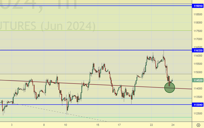 Уровень 114000 представляется оптимальным для покупок. Если мы хотим вверх, то от него надо и идти, в противном случае восходящее движение застопорится.