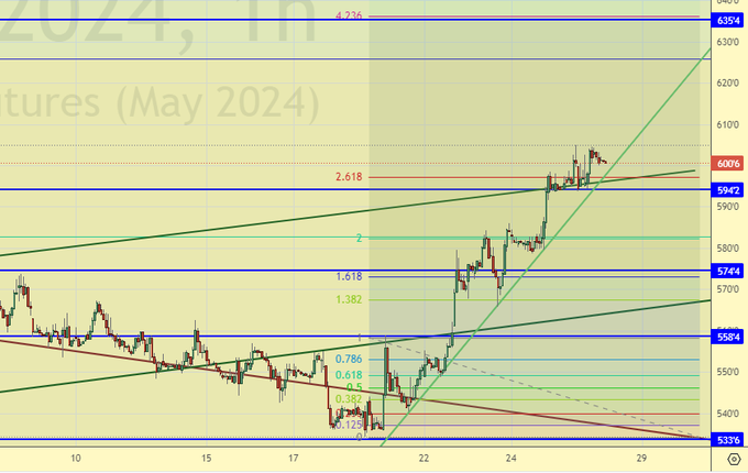 Пока большие сомнения в том, что кукуруза вылетит вверх, но лонг будем держать, раз за него удалось зацепиться. Текущий район, кстати, учитывая то, что мы давно в диапазоне может представлять интерес для поклонников ценового апокалипсиса с ходом на 360.0 уже к концу мая. Доллар будет крепким в этом году.