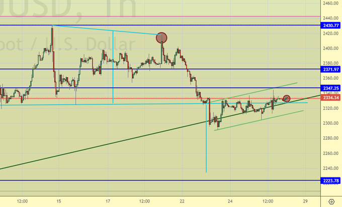 Продажа: сейчас (2334). Стоп: 2352. Цель: 2175. Или при подходе к 2370. Стоп: 2390. Цель: 2175. Кто в позиции от 2415, перенесите стоп на 2390. Цель: 2175.