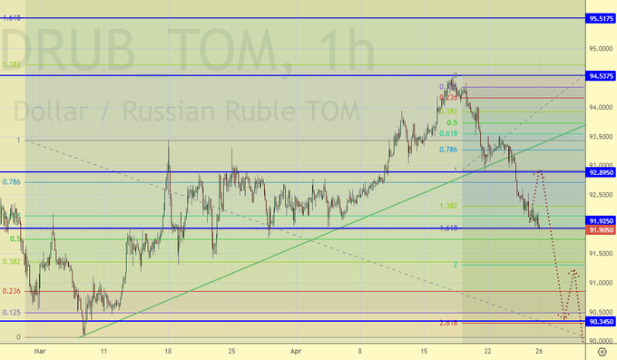 Уперлись в теоретическую цель на 91.90. Можем ли падать безоткатно дальше? Можем. Это усложняет выбор тактики. Тем более, что есть ощущения, что в ряде московских квартир и замков найдут много валюты, что укрепит рубль. Падение на 88.00, возможно.