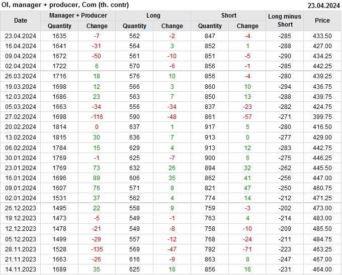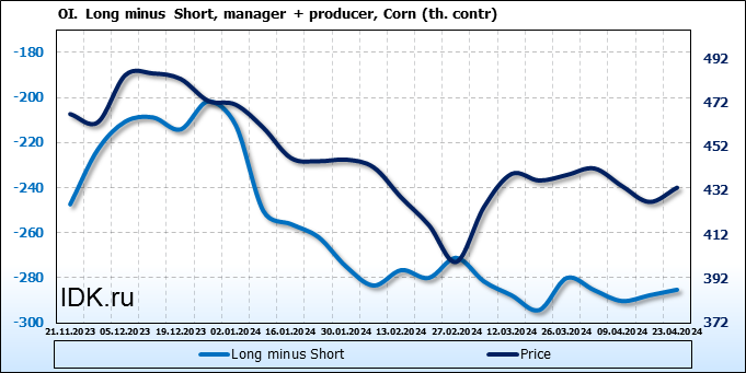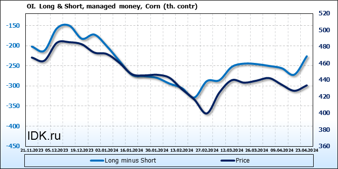 За прошлую неделю, 17.04.24 — 23.04.24, разница между длинными и короткими позициями управляющих сократилась на 45.7 тыс. контрактов. В тоже время, цена выросла на 6.5 цента.