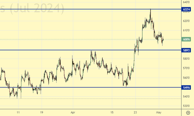Все текущие маневры на рынке воспринимаем через призму ожидания майского отчета USDA. Да, где-то подсушило, но где-то и увлажнило, поэтому истерики отбрасываем, на провокации не поддаемся. Естественным развитием событий будет падение цен вплоть до середины июля. И только затем, когда выяснится, что что-то где-то недобрали, может как-то привести к росту цен, но это уже во второй половине года. Отмечаем текущую силу доллара, которая должна давить на весь товарный сектор.