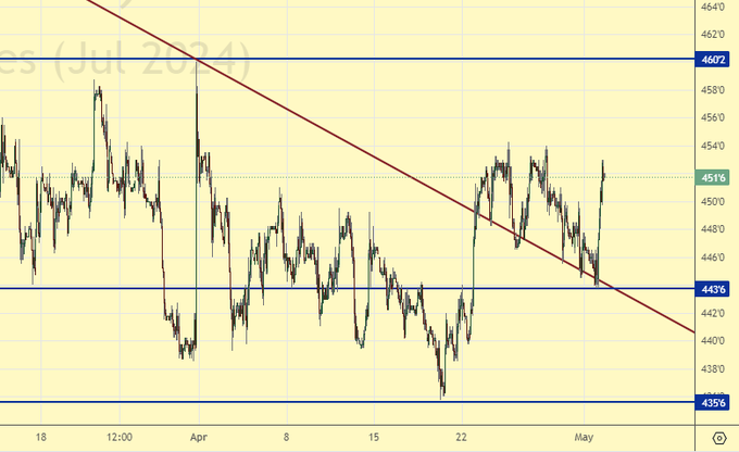 Продажа: нет. Кто в позиции от 452.0 (с учетом перехода на следующий контракт), держите стоп на 456.0. Цель: 360.0.