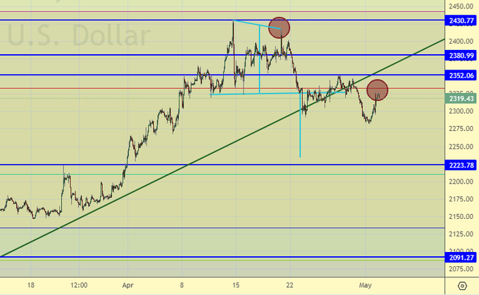 Продажа: нет. Кто в позиции от 2415 и 2336, перенесите стоп на 2356. Цель: 2100 (пересмотрена).