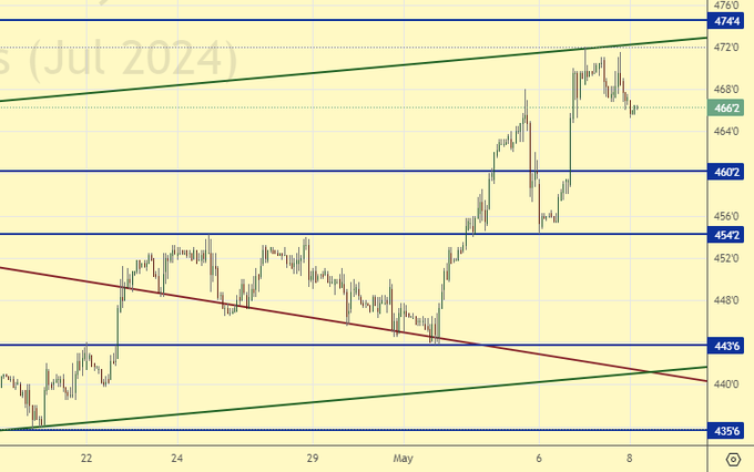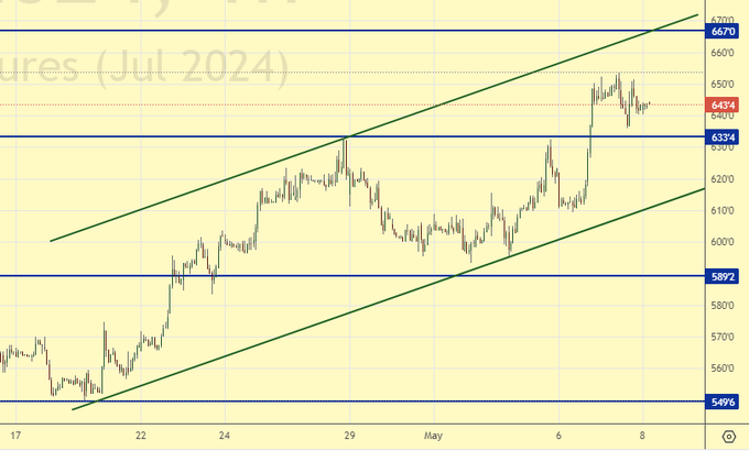 10-го мая выйдет отчет USDA с первым прогнозом по валовому сбору на сезон 24/25. Цены несколько выросли за последние 10 дней, но этот рост может быть ложным. В любом случае, мы ждем откат на следующий день после публикации цифр. В момент выхода отчета (вечер пятницы) можем увидеть и рывок вверх, но вряд ли он будет однонаправленным и безоткатным.