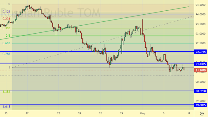Можем пока, даже просто по инерции, укрепиться до 90.00. При этом понимаем, что дальнейшее укрепление, если оно состоится, это временное явление. Содержать Армию в настоящий момент крайне дорого, эмиссия денег продолжится, что должно нас привести при спокойном сценарии к уровню 105.00 к концу года.