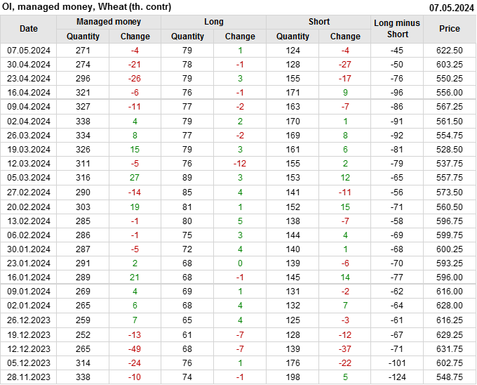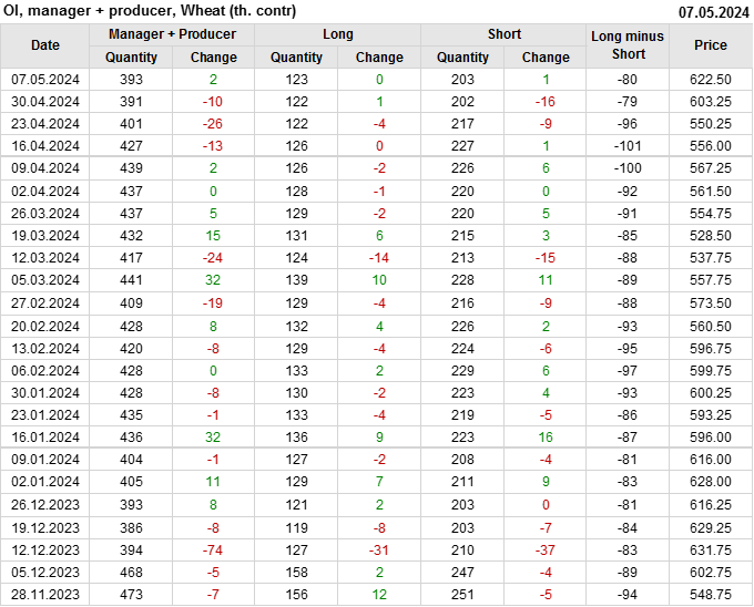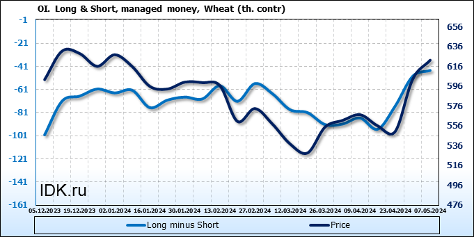За прошедшую неделю, 01.05.24 — 07.05.24, разница между длинными и короткими позициями управляющих сократилась на 5.1 тыс. контрактов. В тоже время, цена выросла на 19.25 цента.